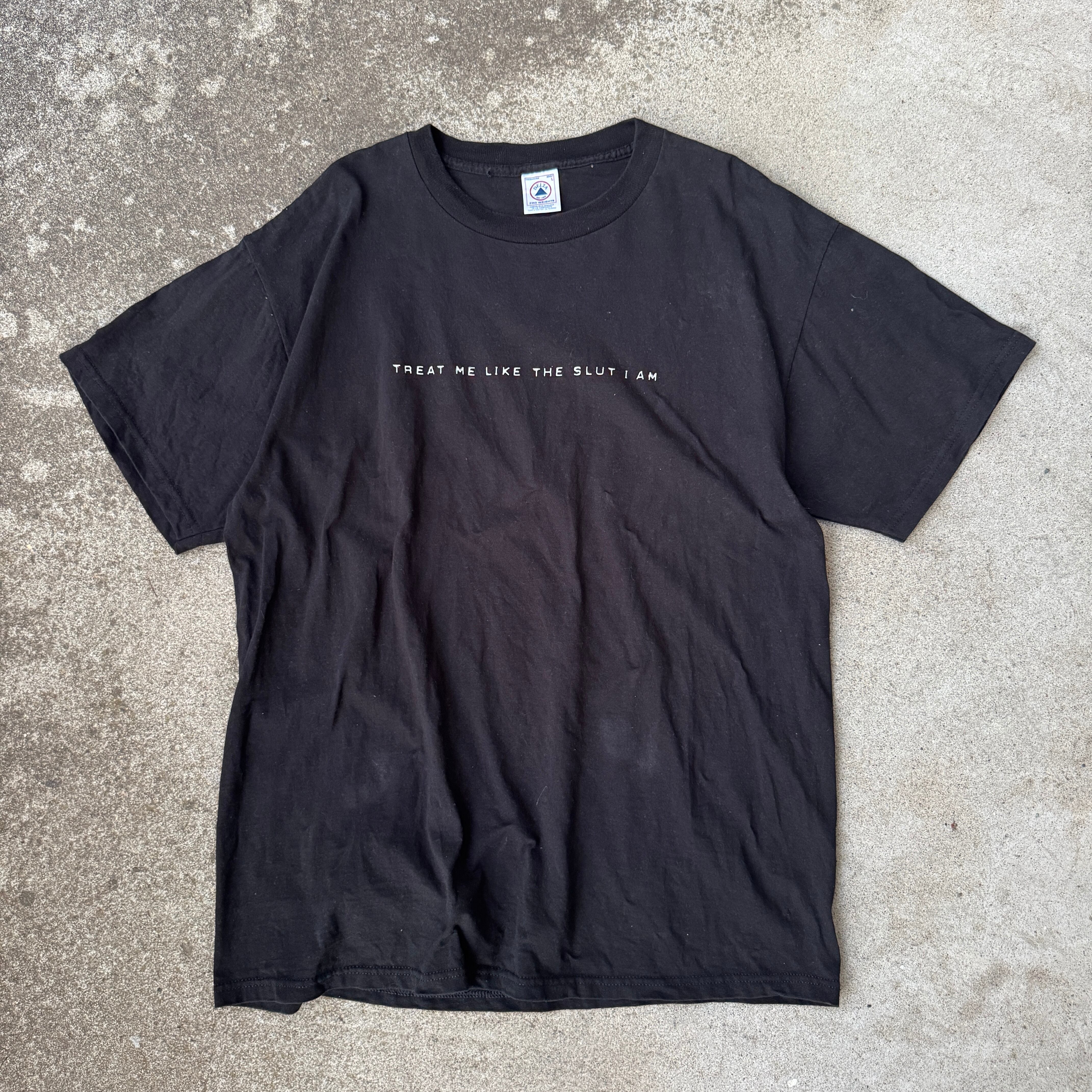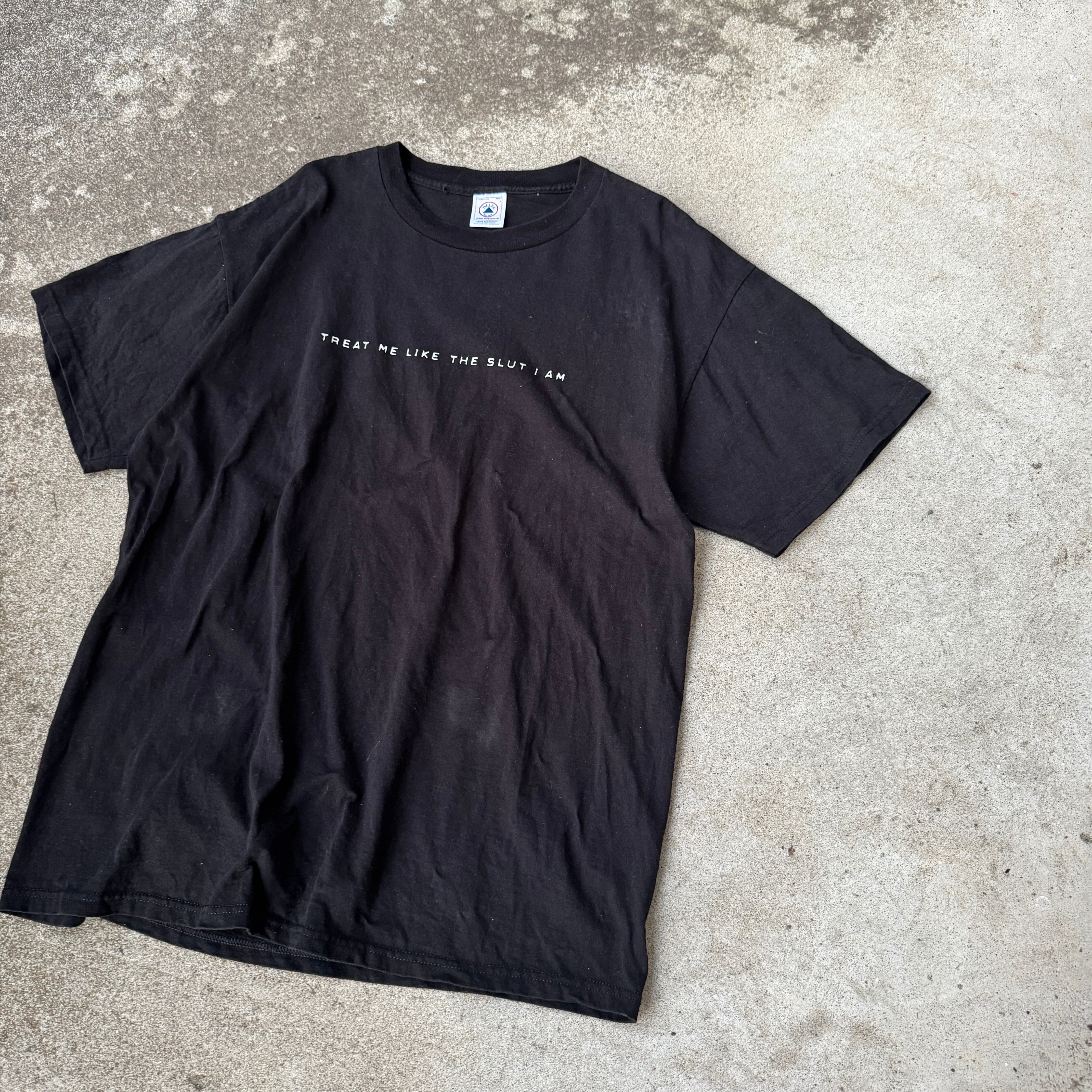 フロント中央に「TREAT ME LIKE THE SLUT I AM(私はそのまま扱って)」と挑発的な言葉が配された、ストリート・Y2K・パンク系スタイルに映える一枚です。