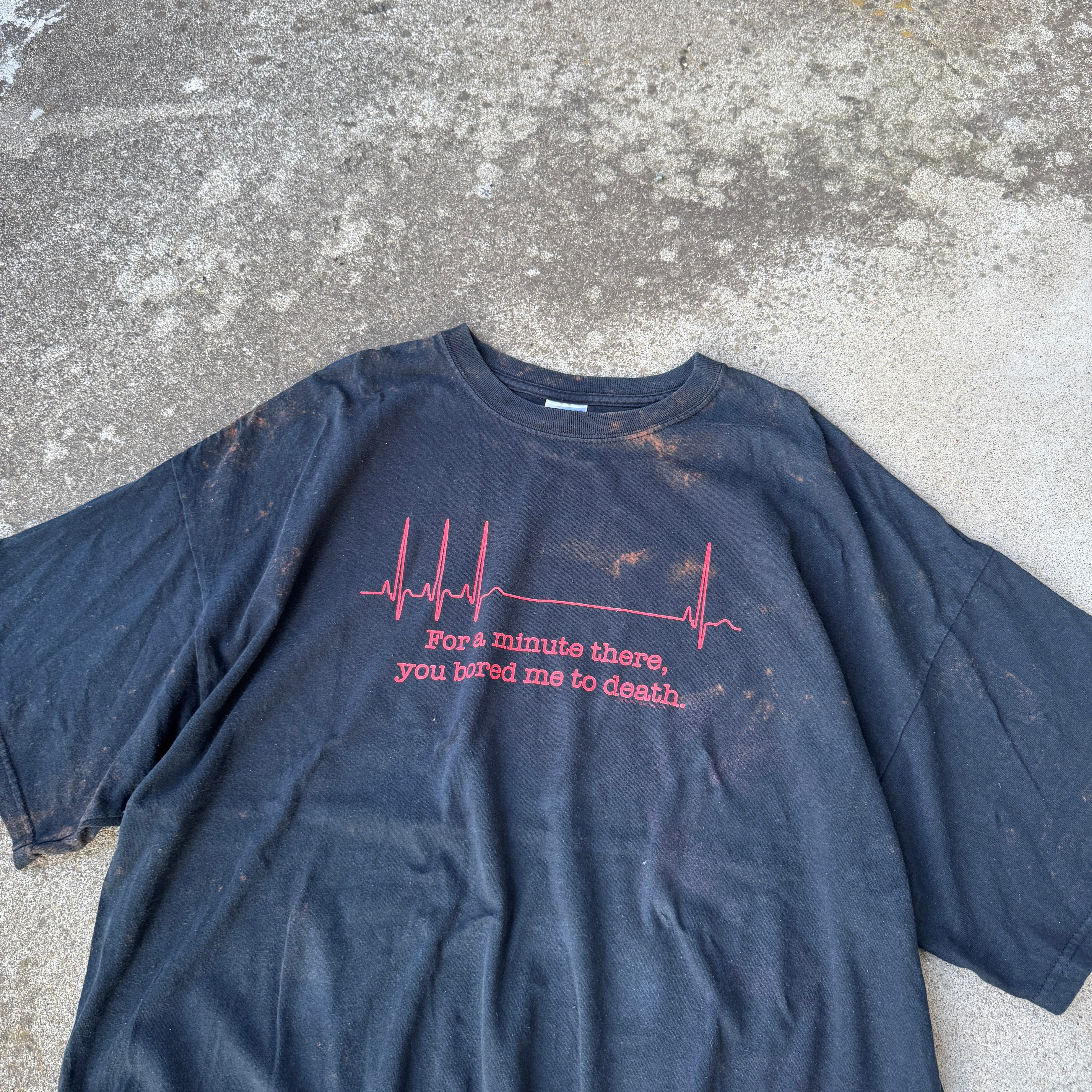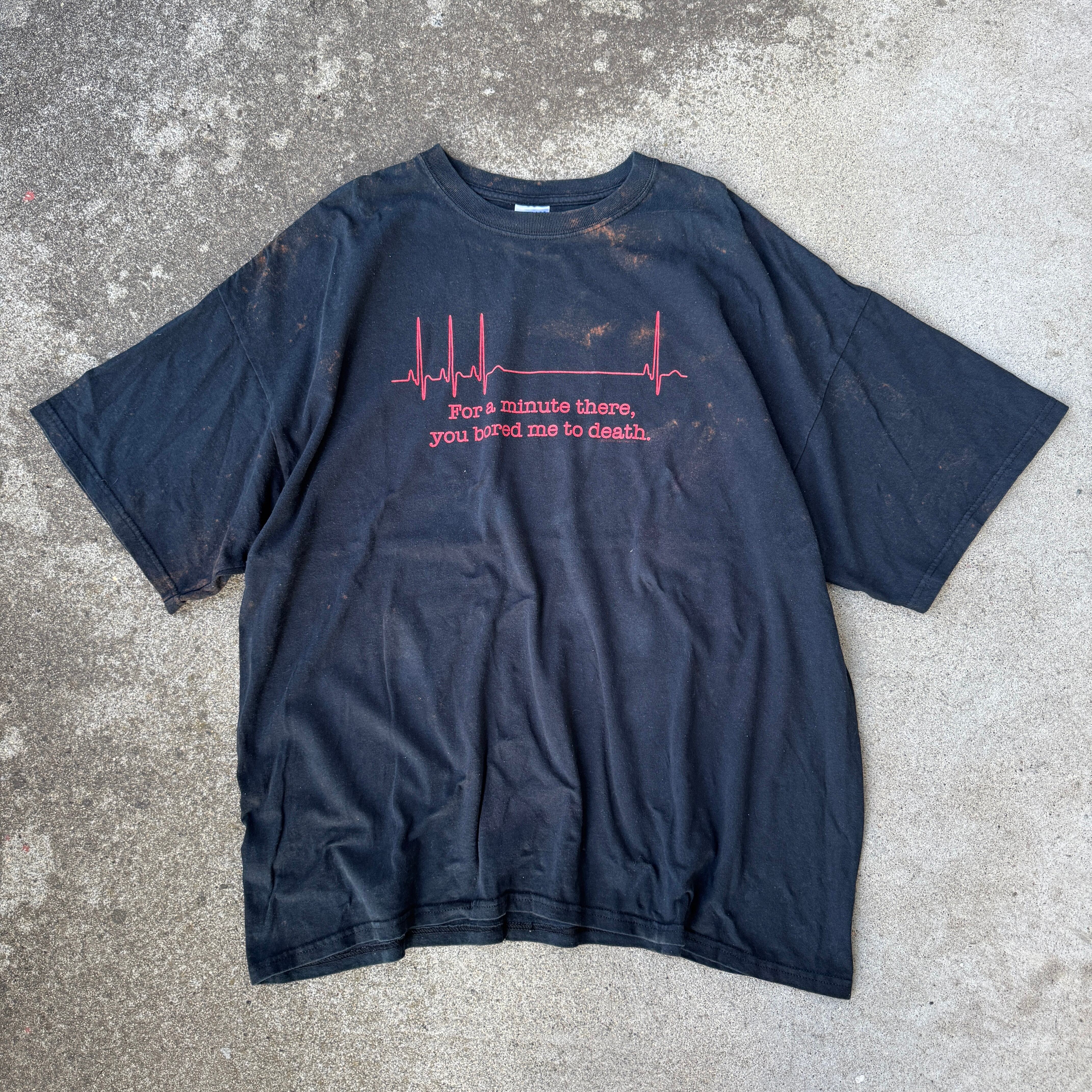 ブラックボディに、赤の心電図ラインと「For a minute there, you bored me to death.(さっき一瞬、退屈すぎて死にそうだったよ)」という刺激的なメッセージがプリントされた1枚。