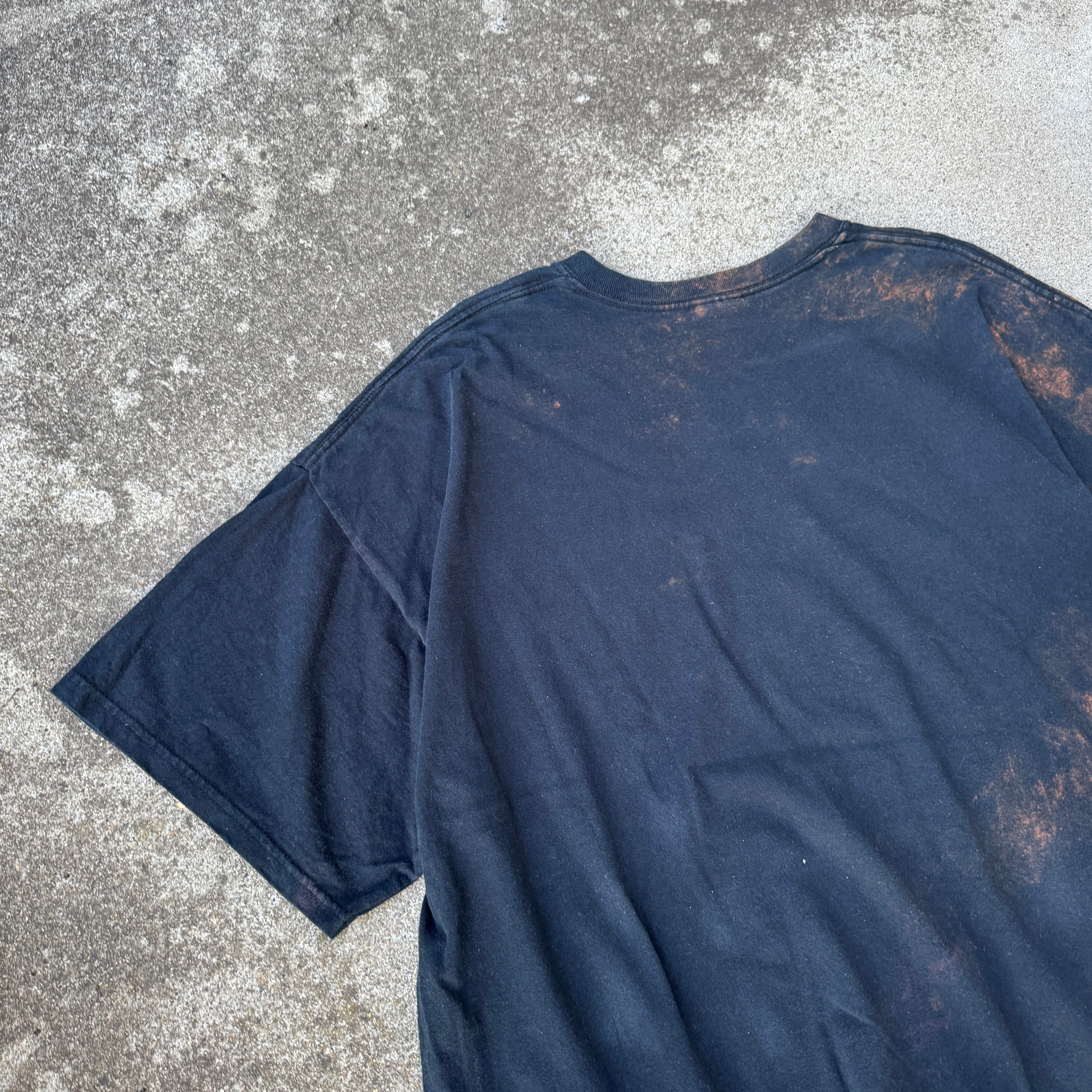 ブリーチ加工によるまだらな脱色がヴィンテージライクな雰囲気を醸し出しており、アナーキー/パンク/Y2K/グランジ好きには刺さるデザインです。