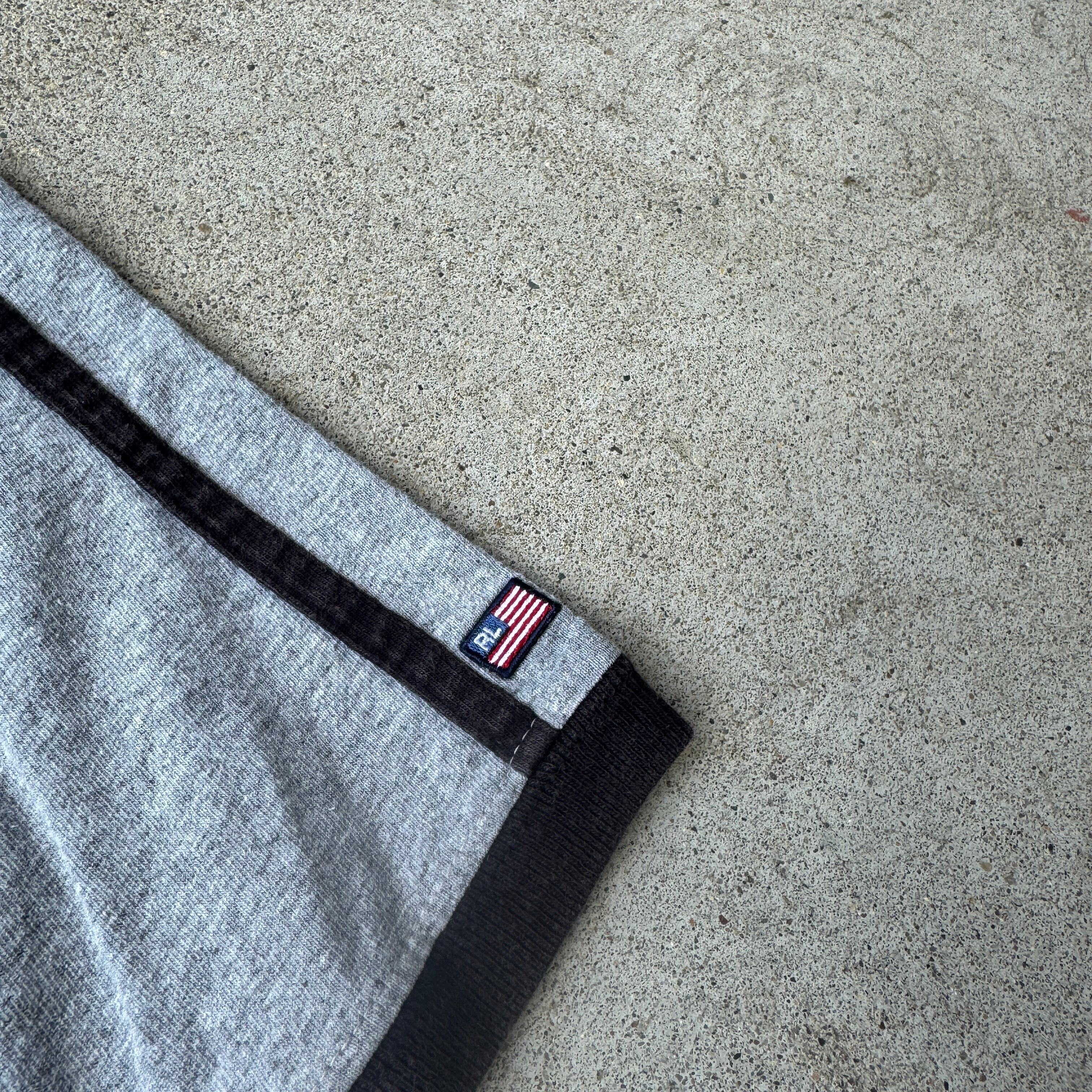 ラグランスリーブに施された配色ライン、クラック加工が映えるRLロゴプリント、アメリカンカジュアル全開の一着です。