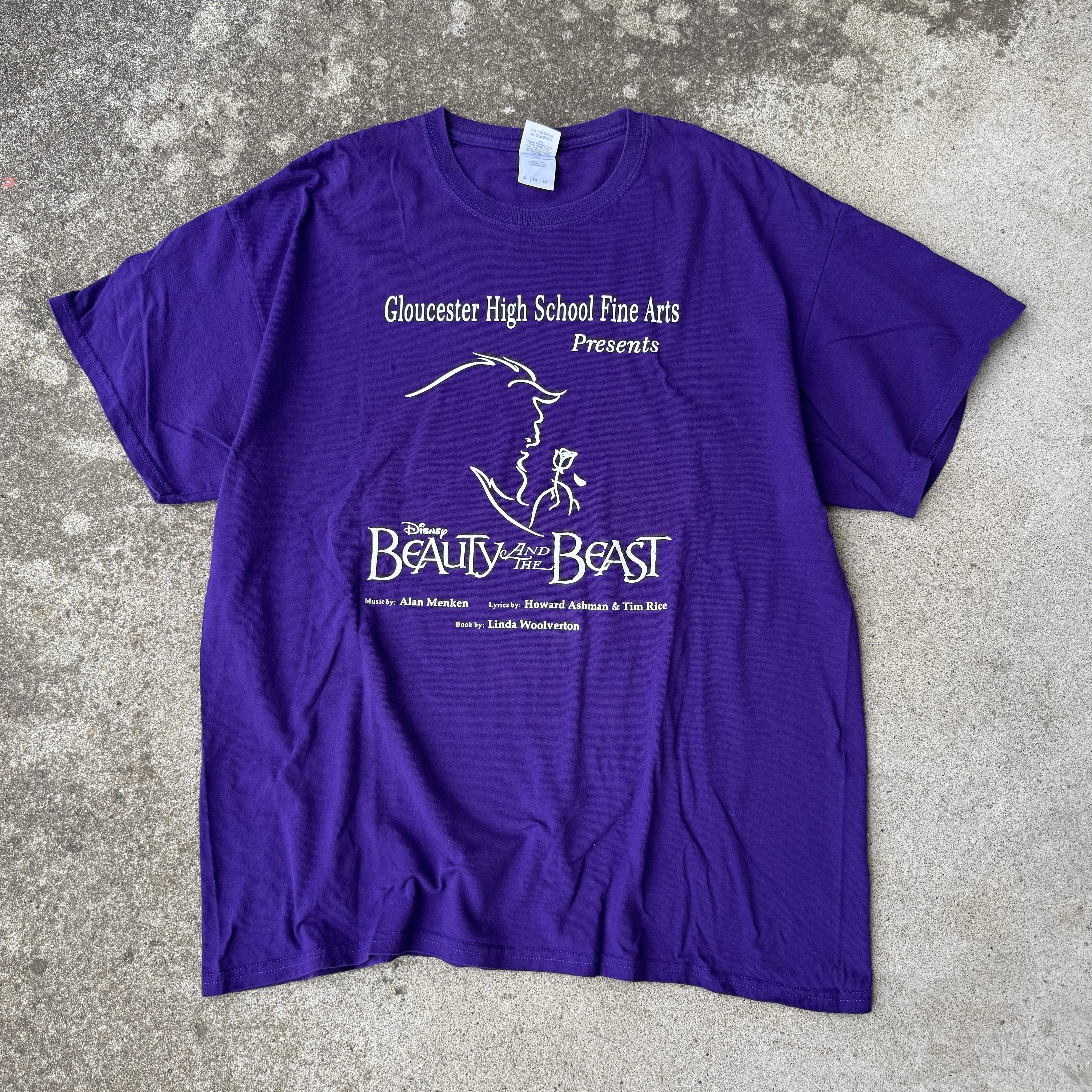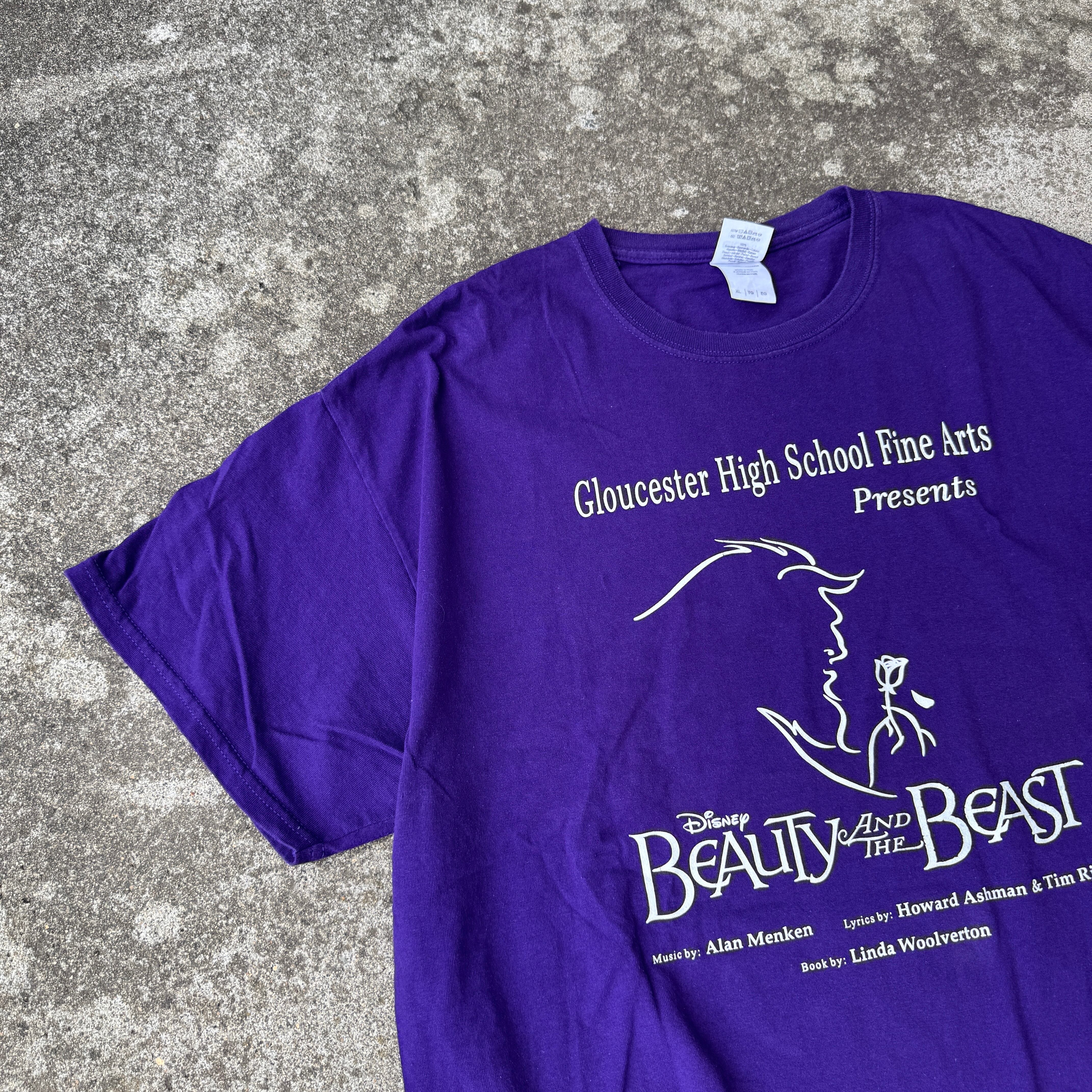 ディズニーの名作『美女と野獣(Beauty and the Beast)』をモチーフにした、Gloucester High Schoolの舞台公演記念Tシャツ。美しいシルエットで描かれたビーストとベルのイラストが目を引く、ファンにはたまらないアイテムです。
