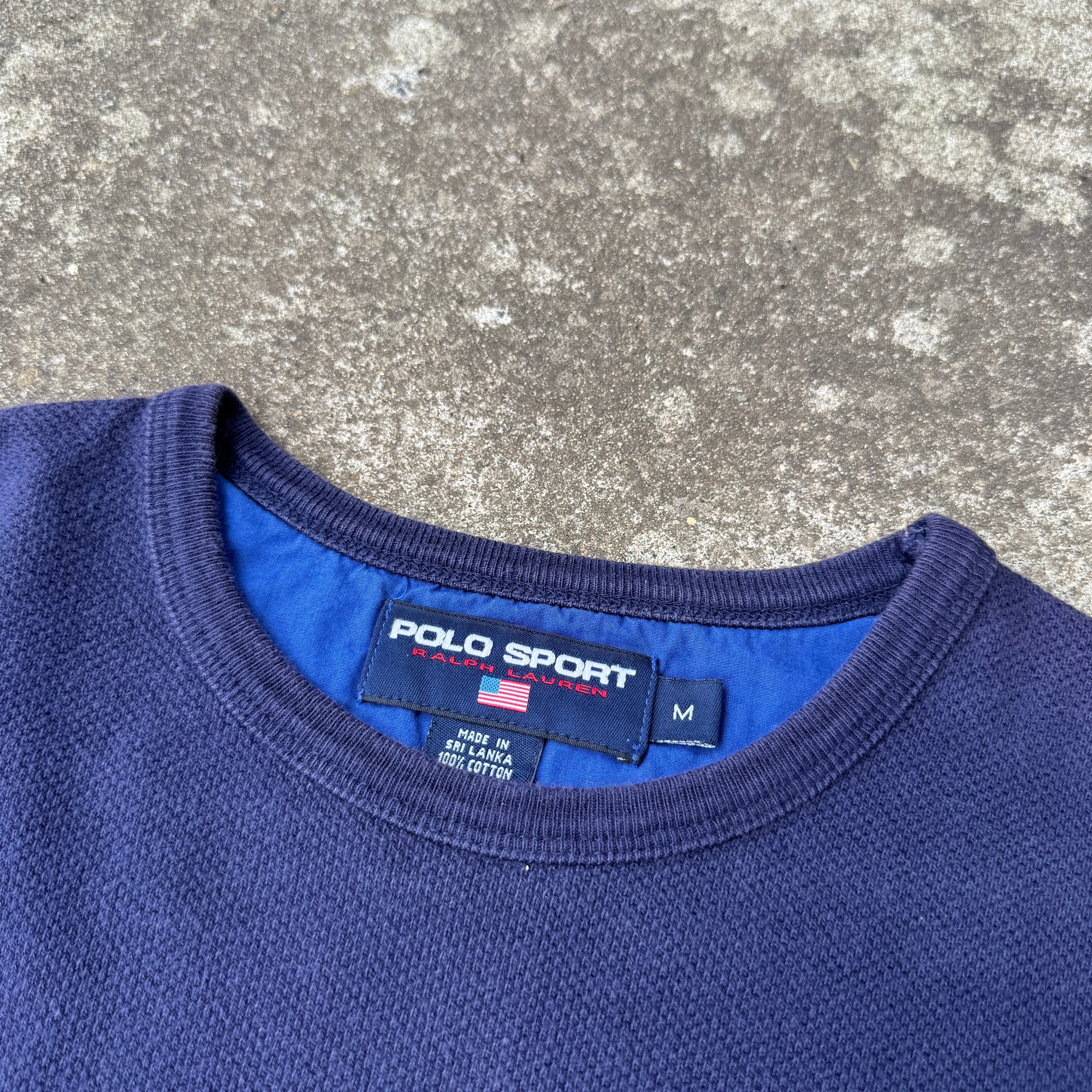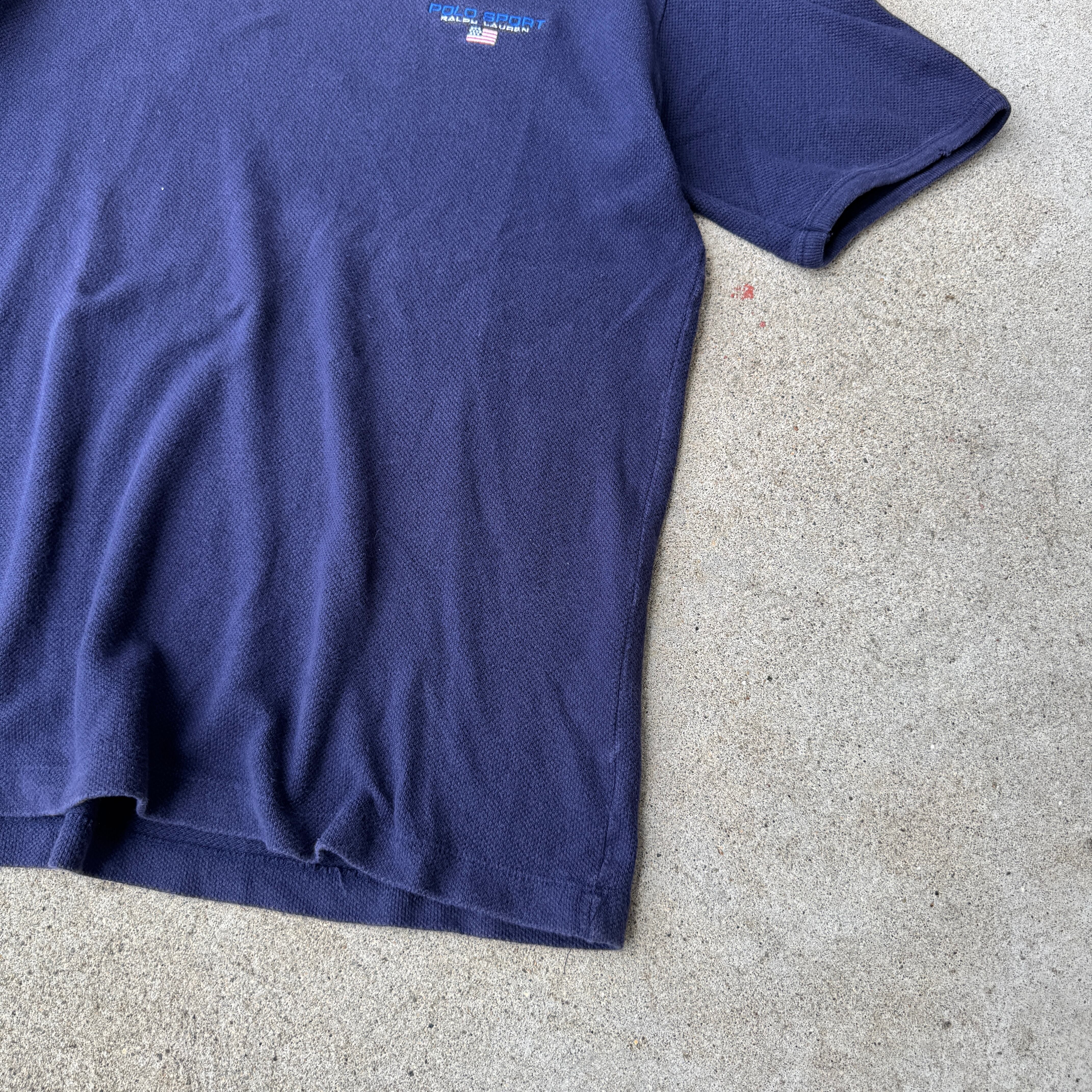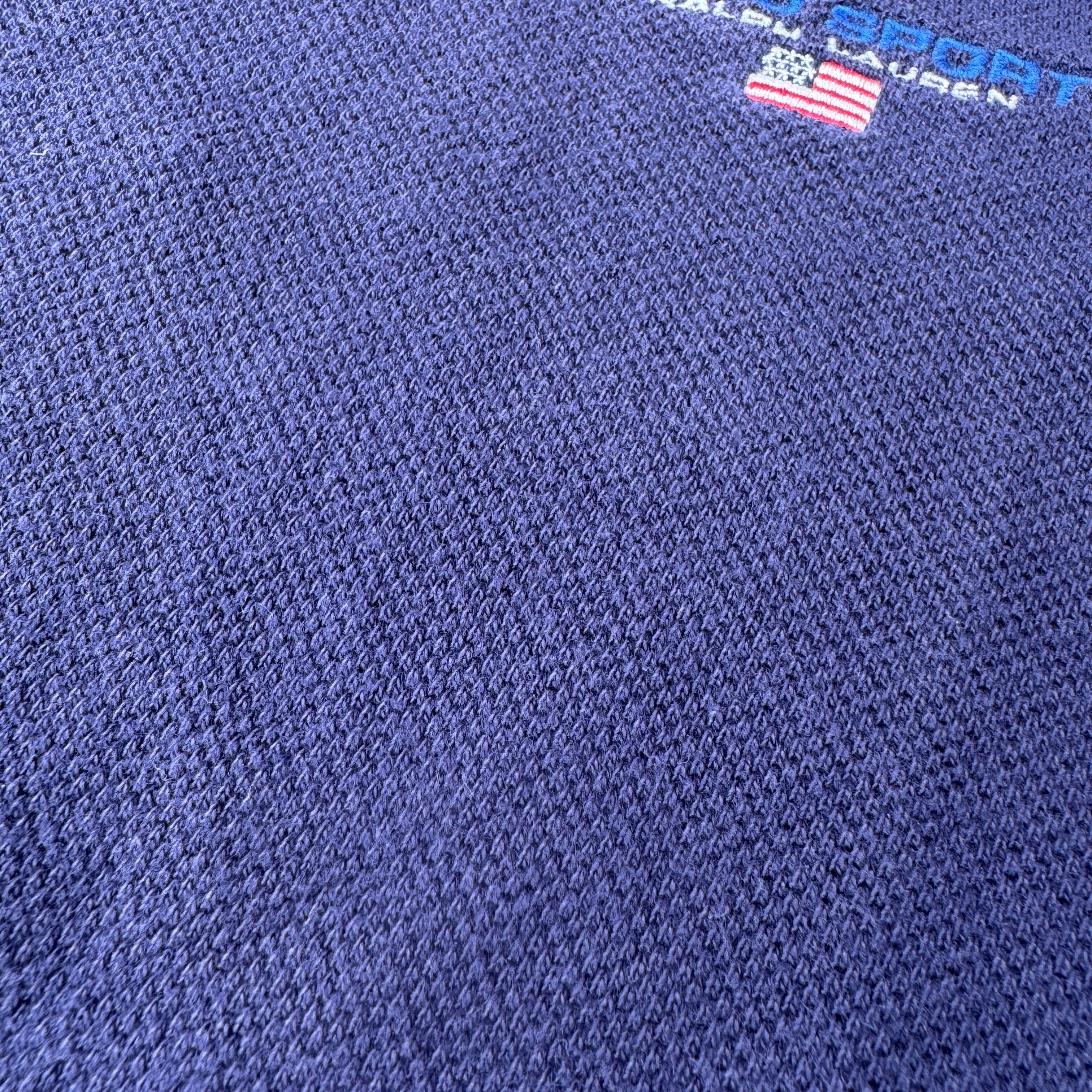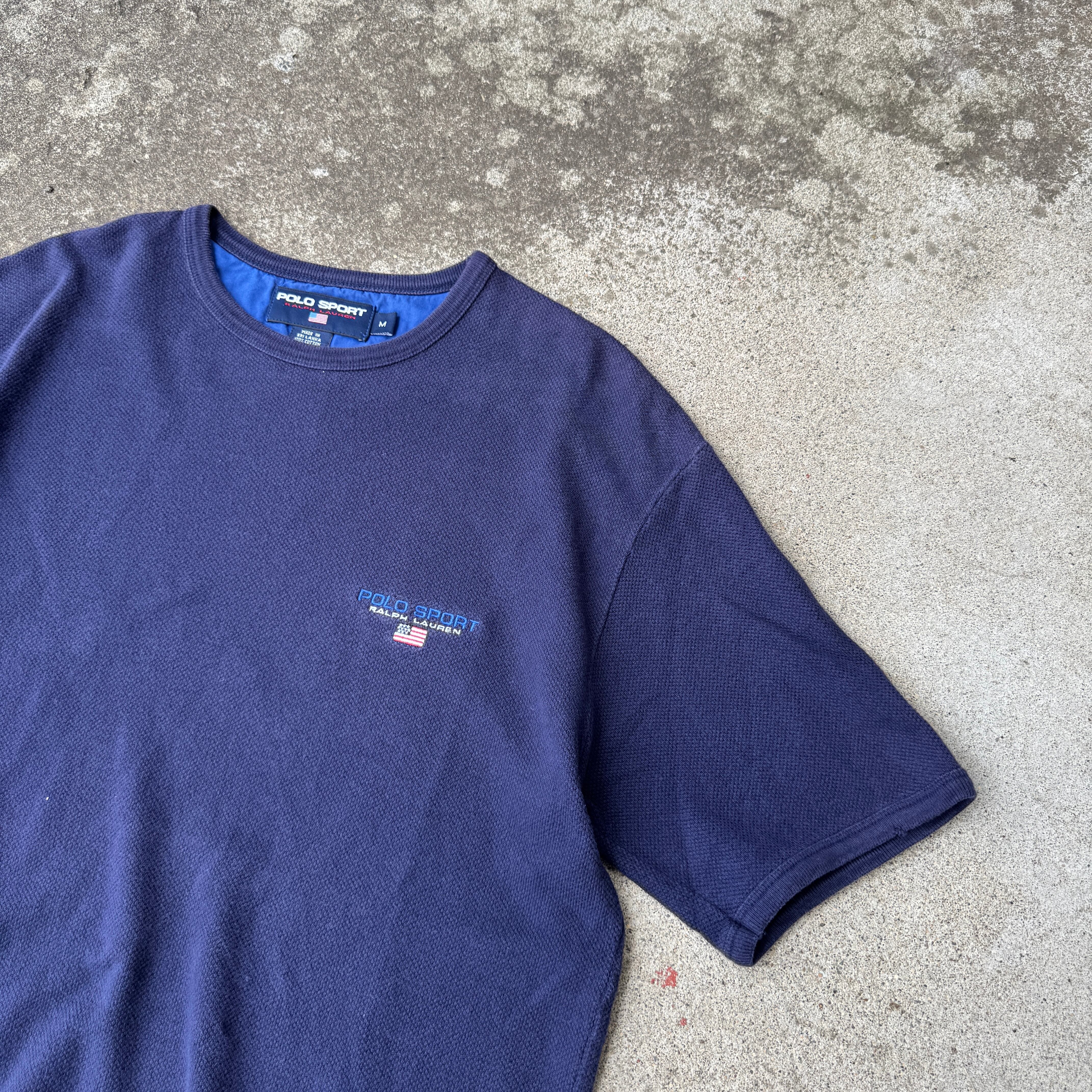 90s〜00sの名作ライン、POLO SPORT(ポロスポーツ)のヴィンテージTシャツ。胸元には象徴的な「USAフラッグ」とブランドロゴの刺繍が施され、ミニマルながら強い存在感を放ちます。
