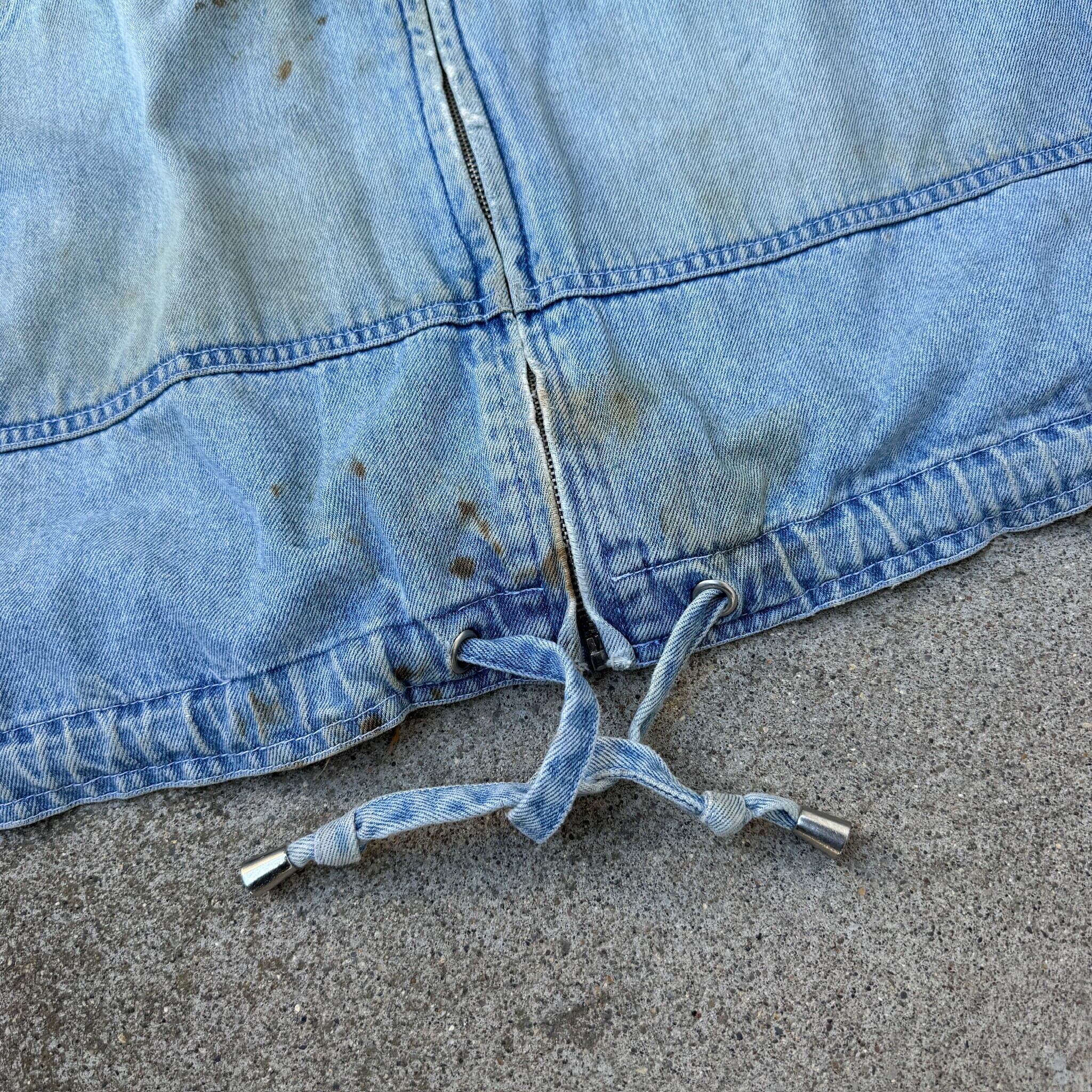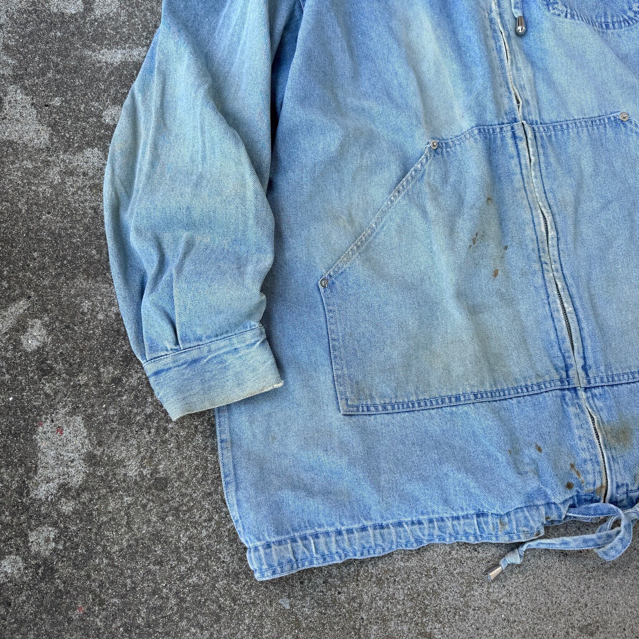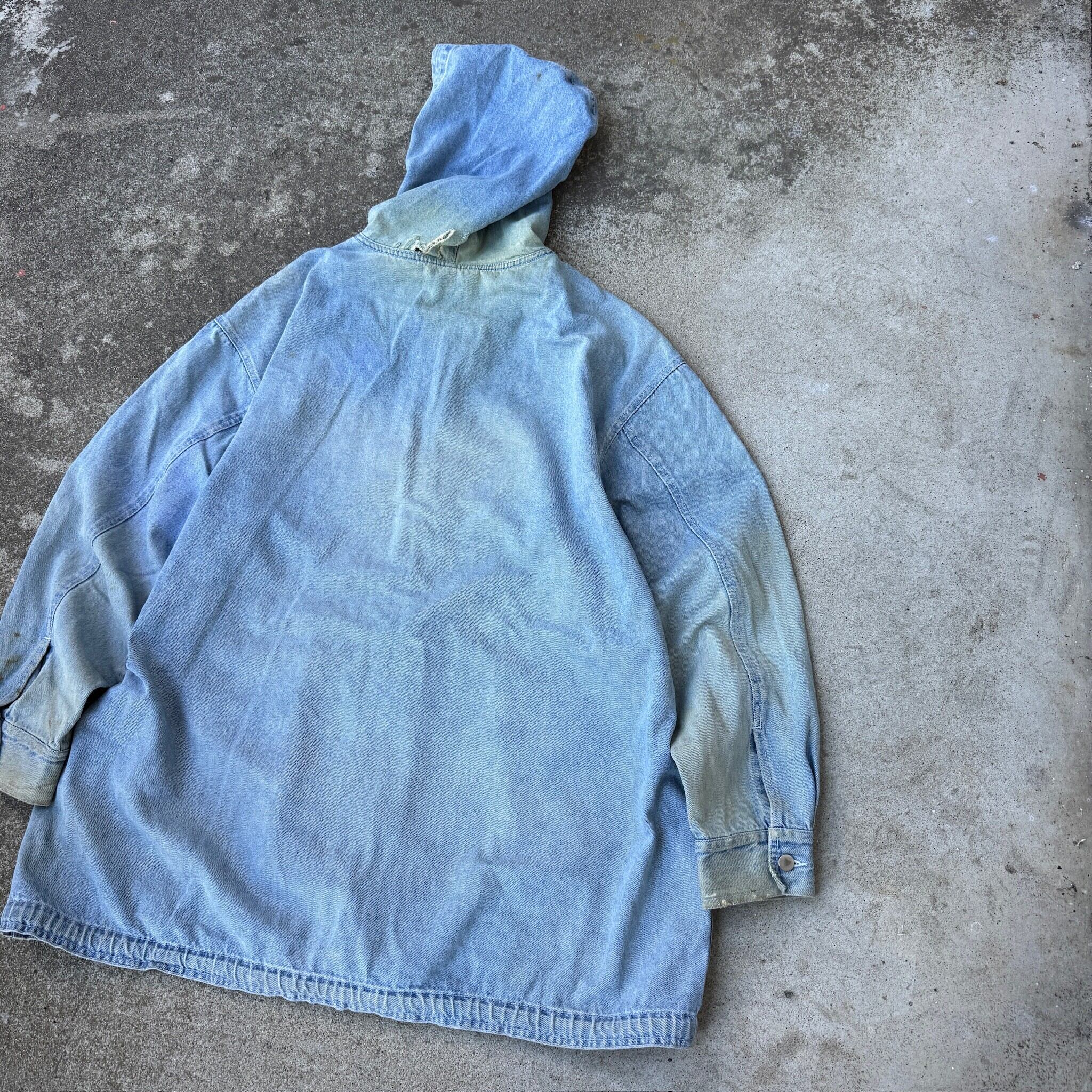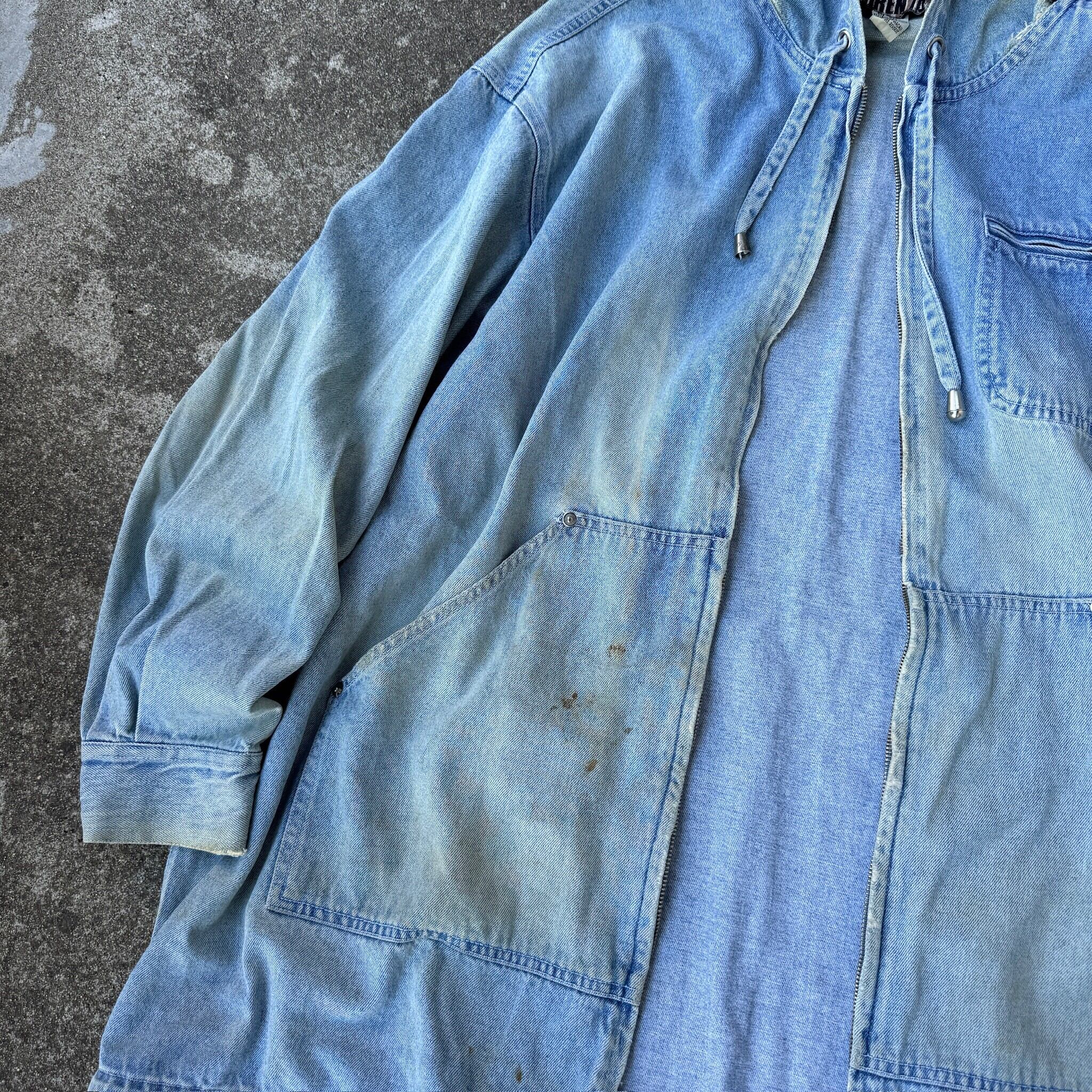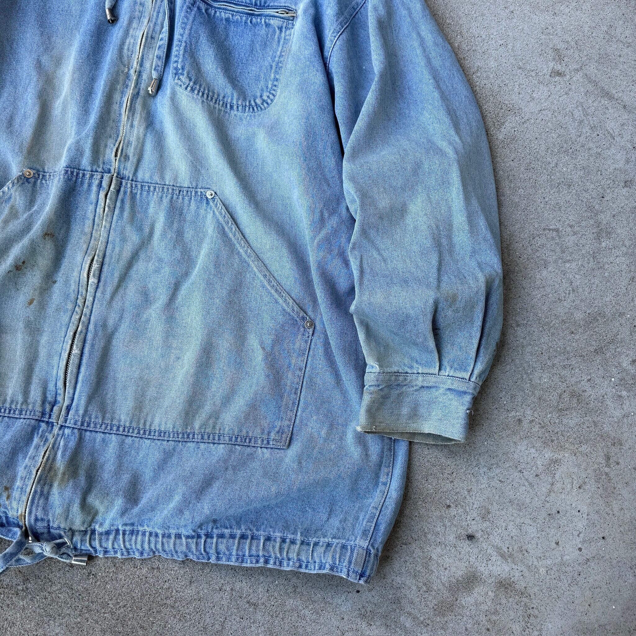 1980's "FORENZA" denim zip up hoodie boro indigo active jacket damage XL / 80年代〜 デニム ジップアップ ジャケット フーディー パーカー アクティブジャケット インディゴ 襤褸 ボロ ダメージ