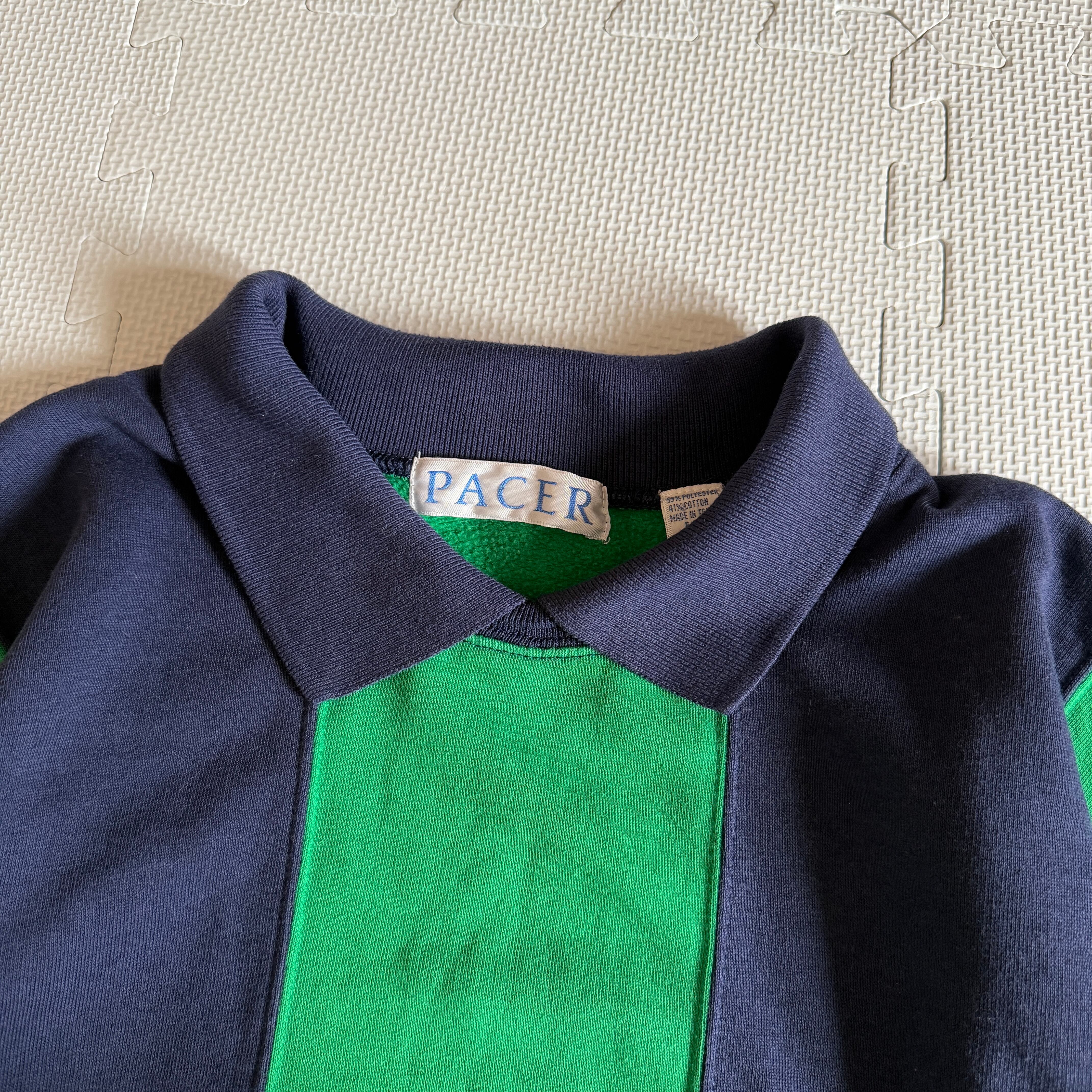 1990年代の北米カジュアルウェア市場において、PACERは品質とデザインを両立させた日常着として親しまれました。本品は「MADE IN TAIWAN」表記の90年代アーカイブ。当時のフィットネスブームやプレッピースタイルの再解釈により生まれた、襟付きスウェット(ポロ・スウェット)という独特のカテゴリーに属する1着です。