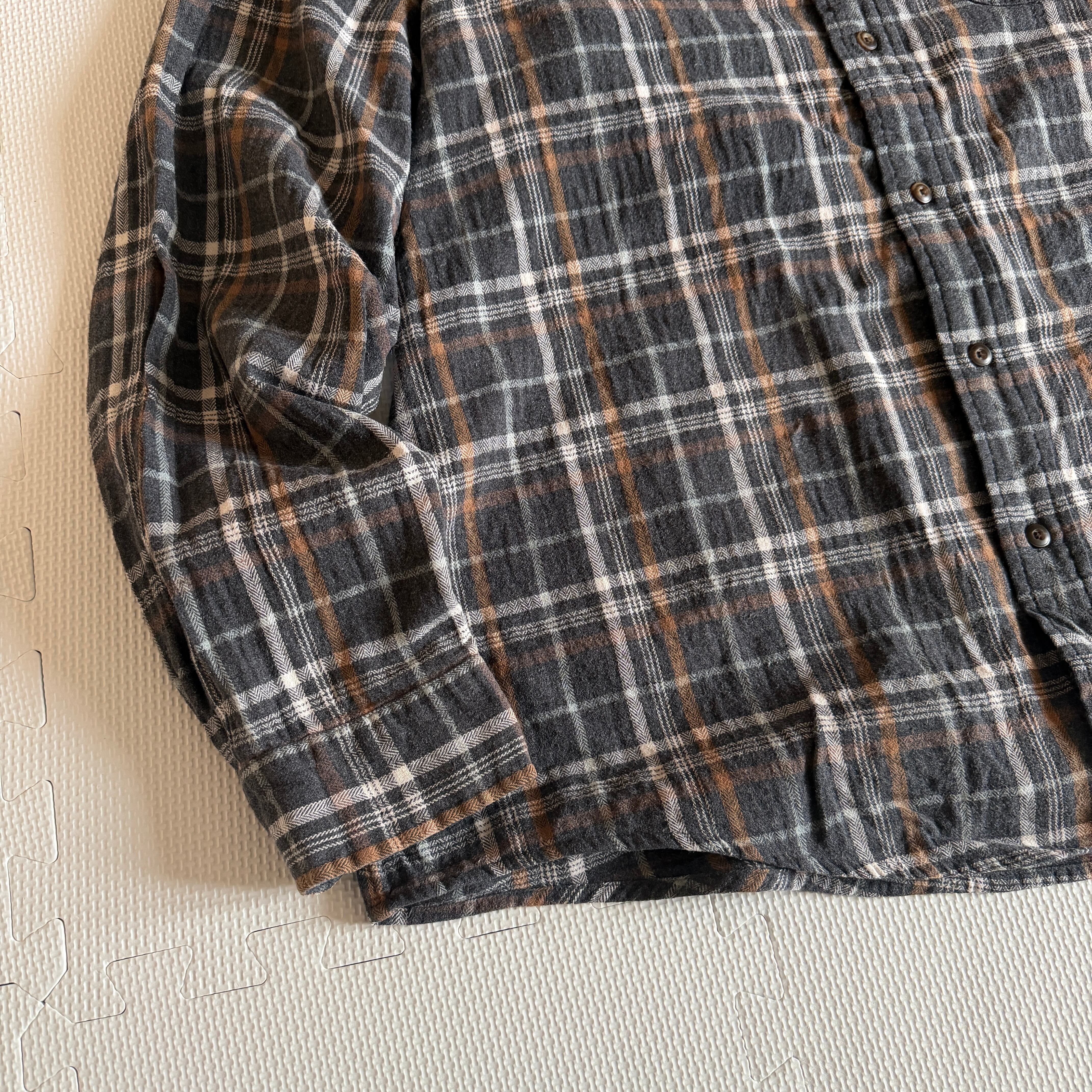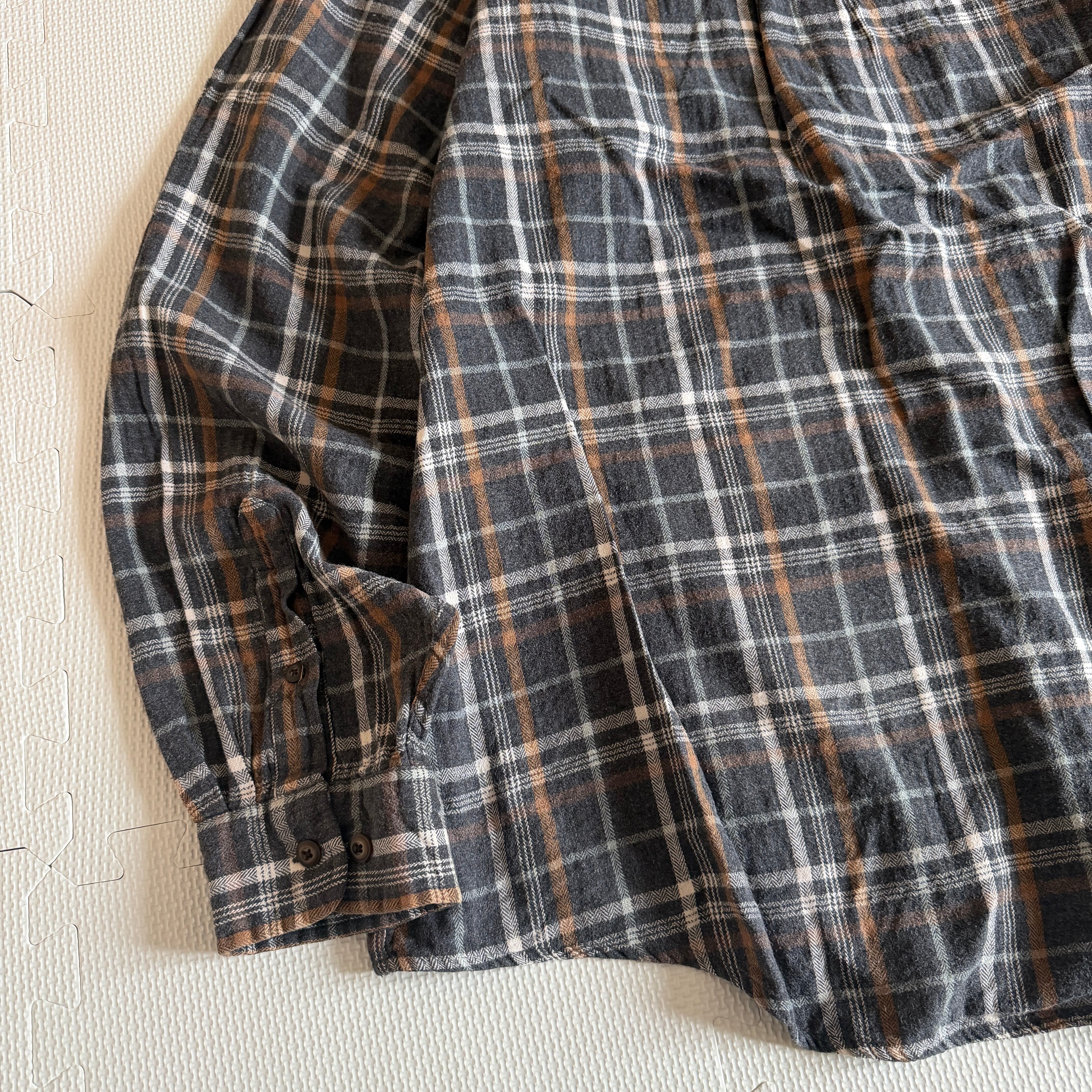 現行のファストファッションブランドで見られる薄手のネルとは一線を画す、度詰めのヘビーウェイトコットンが最大の特徴です。繰り返しの洗濯にも耐えうる頑丈な縫製と、長年の着用でさらに風合いが増す「育てる楽しみ」がある一着。特有のフェード感は、当時の染料と織り技術が融合した、ヴィンテージさながらの奥行きを感じさせます。