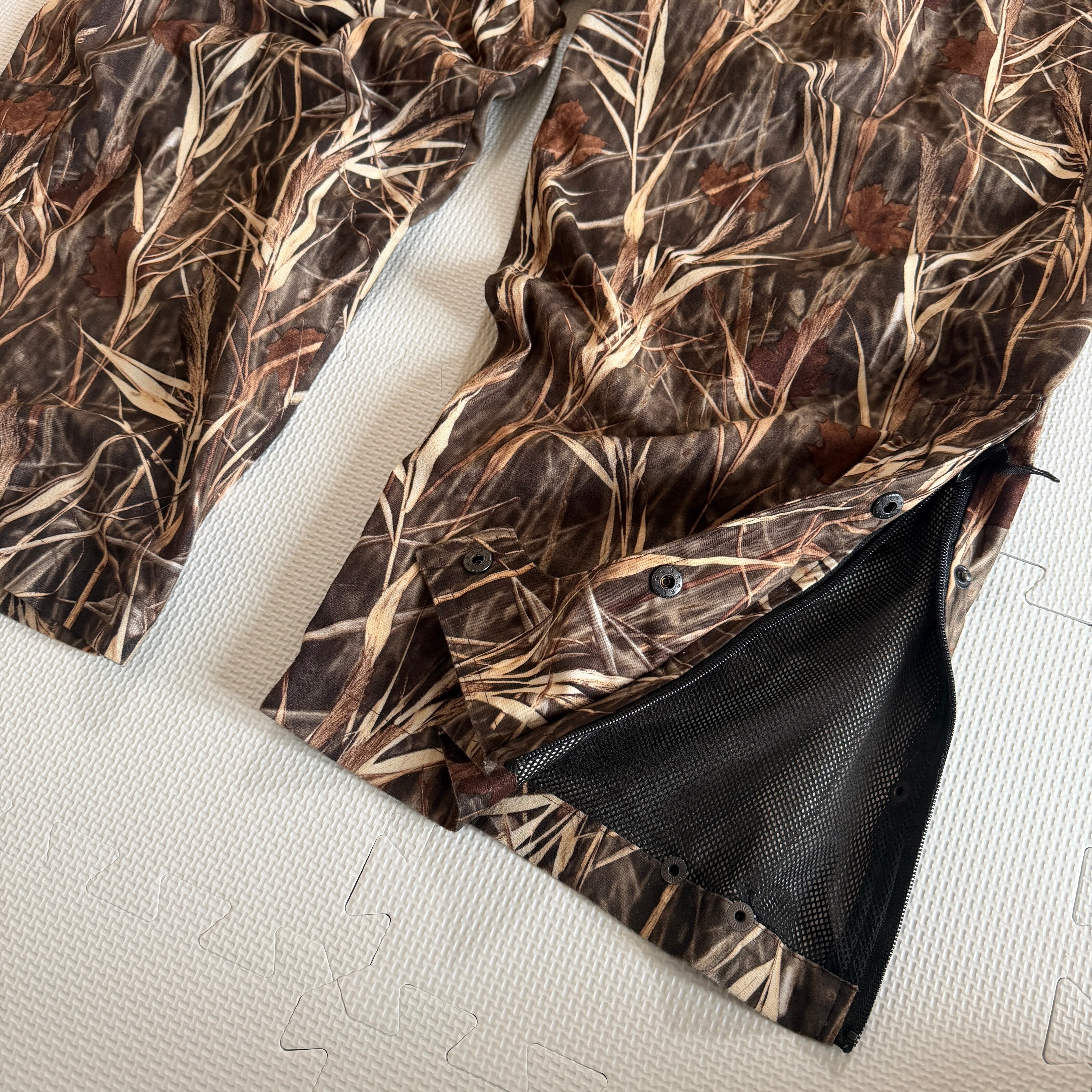 現行の安価なポリエステルプリントとは異なり、肉厚でソフトな質感が最大の特徴です。生地の凹凸が光の反射を抑え、リアルツリー柄が浮かび上がるようなフェード感はヴィンテージならでは。また、裾の3段構造(ジップ・スナップ・コード)は、他のハンティングブランドと比較しても非常に高い汎用性を誇ります。