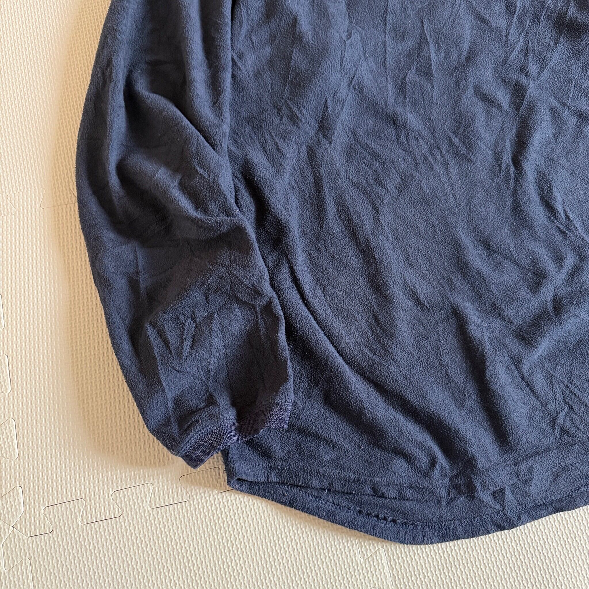 現行のポリエステル素材に比べ、肉厚ながらもしなやかで、肌なじみの良い質感。20年以上の経年により、新品にはない深みのあるネイビーへと変化しています。特にこの個体は、裾がシャツのようなラウンド仕様になっており、運動性を確保しつつファッション性を高めた、当時のデザイナーの意図が伺える希少なディテールです。