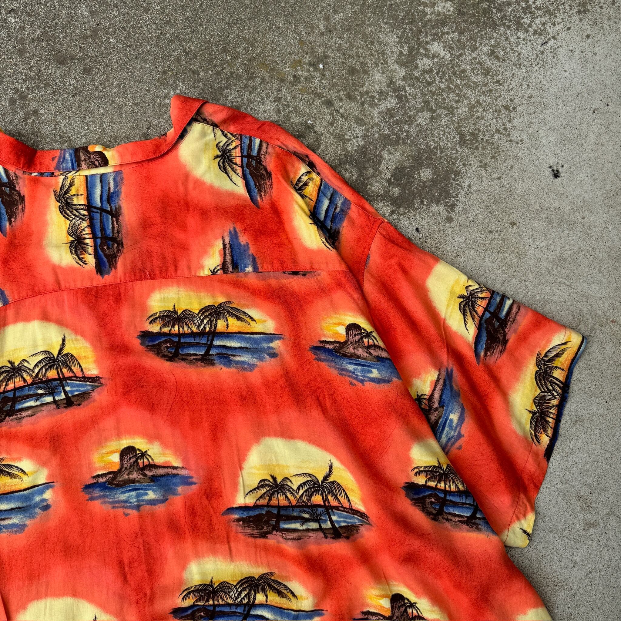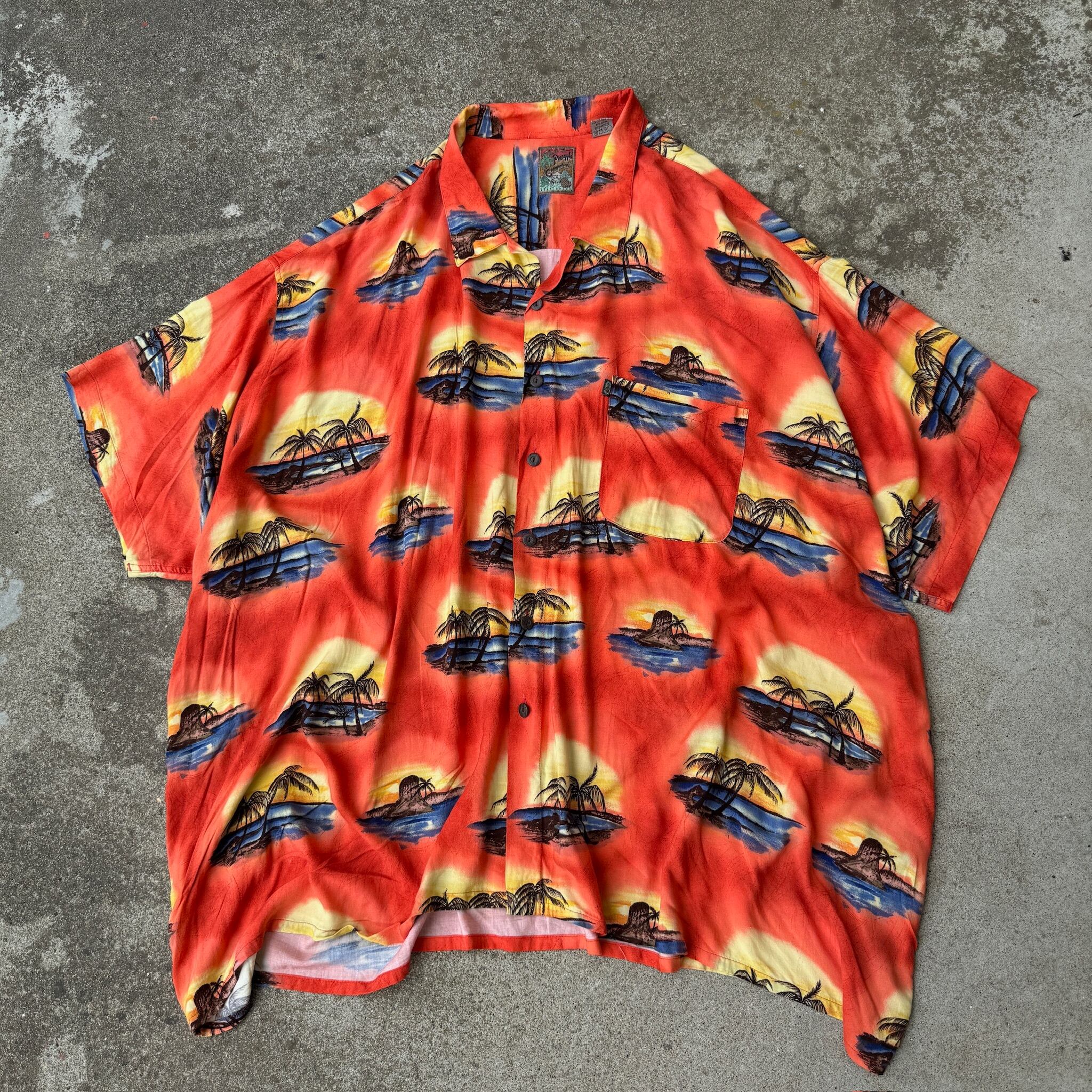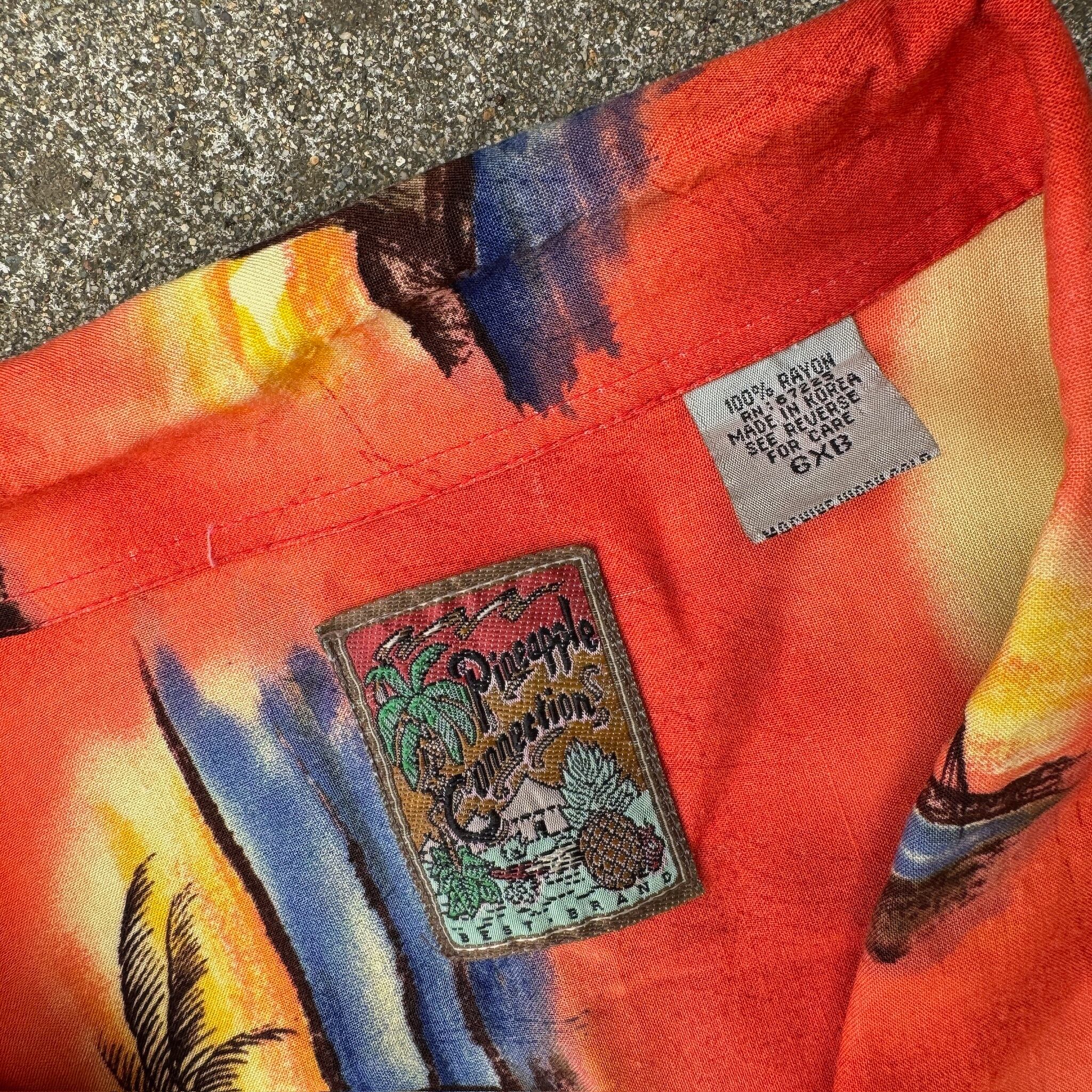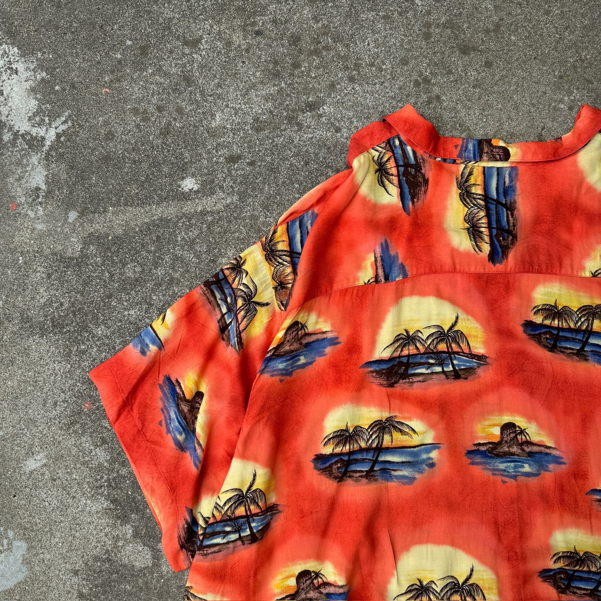 100%レーヨンの6XLサイズ、ボヤってる夕焼けカラーのオレンジで、ヤシの木が数々と。