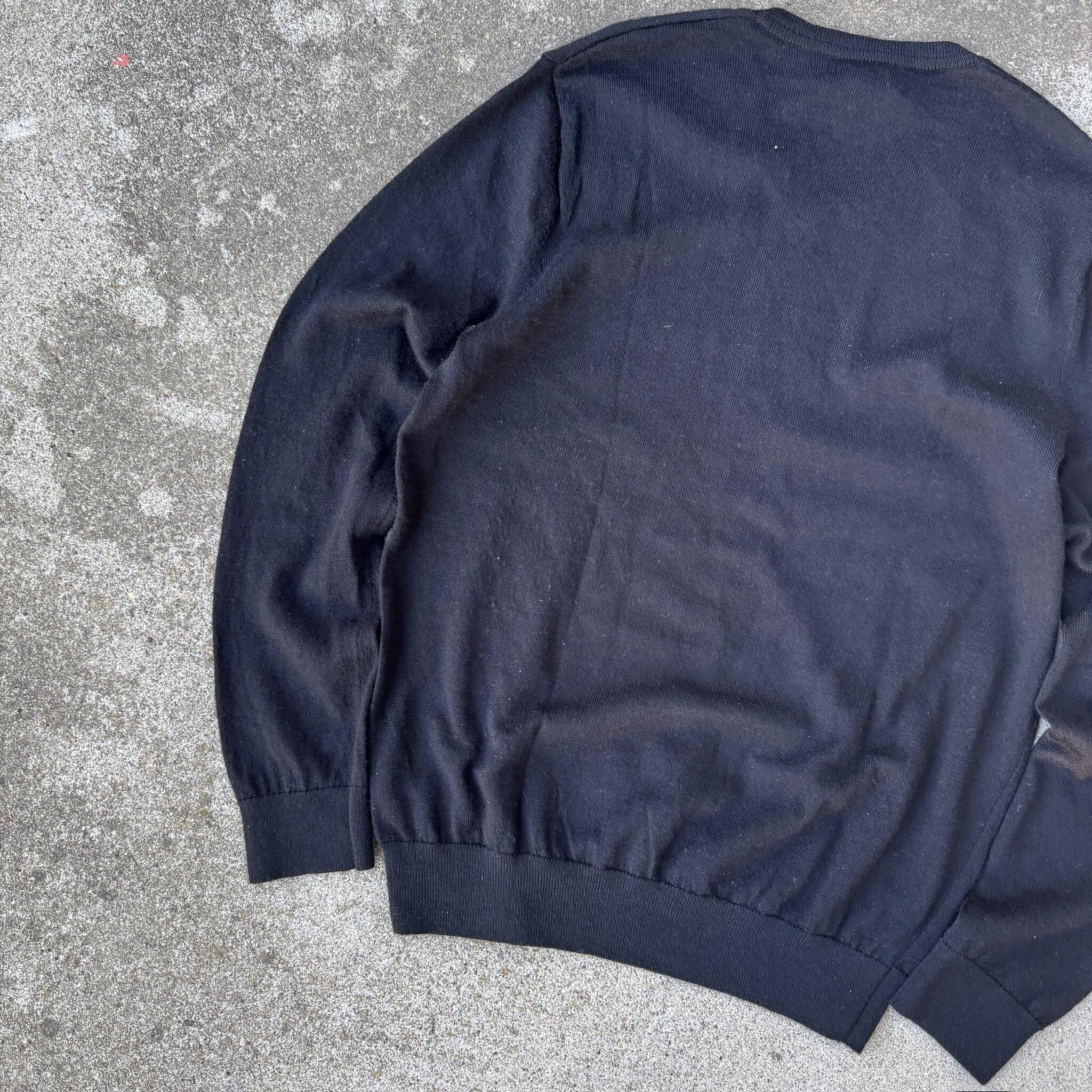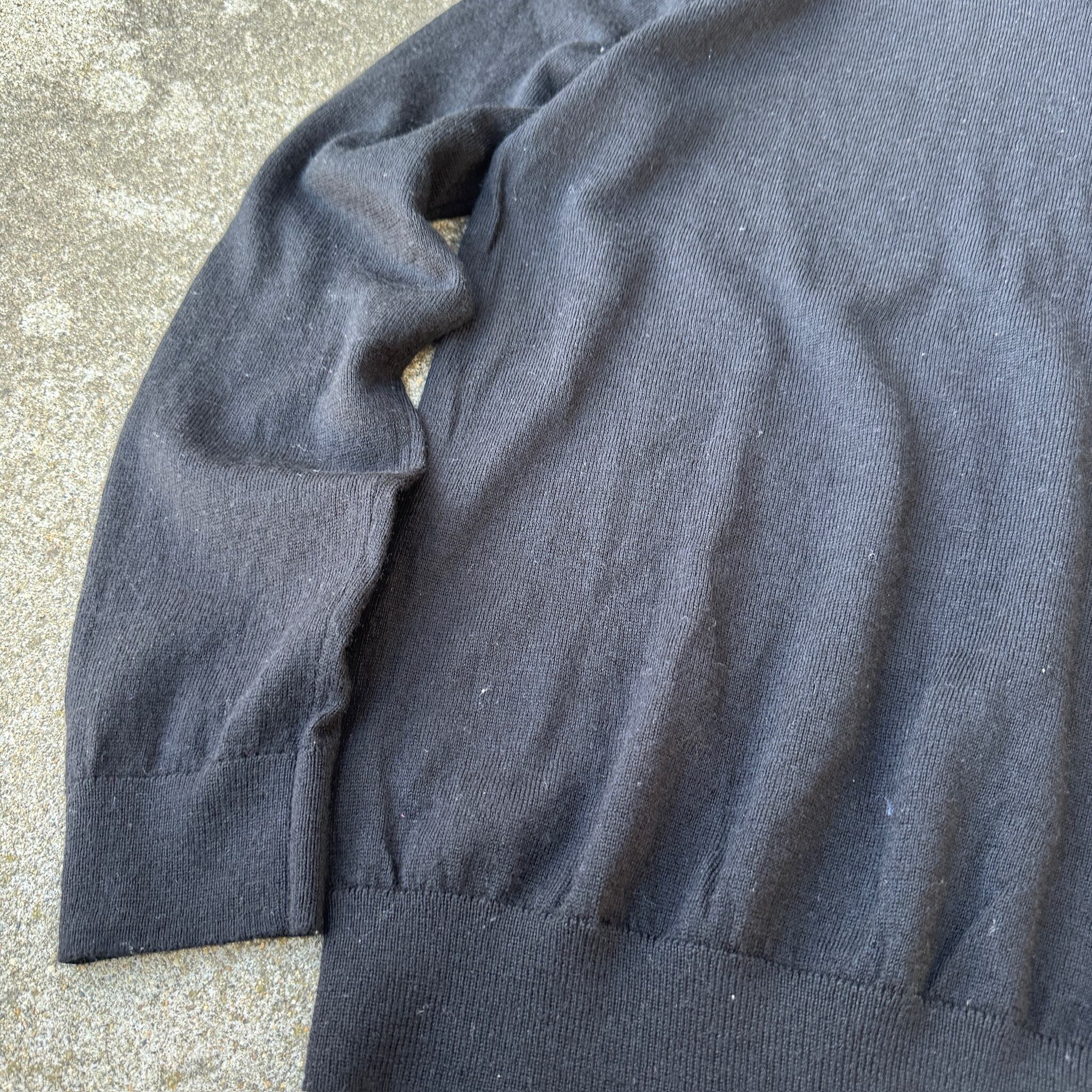 ブラックでVネックで非常に上品な作りとなっています、デニムとかカーゴパンツで丁度良く外しになるかなと。
